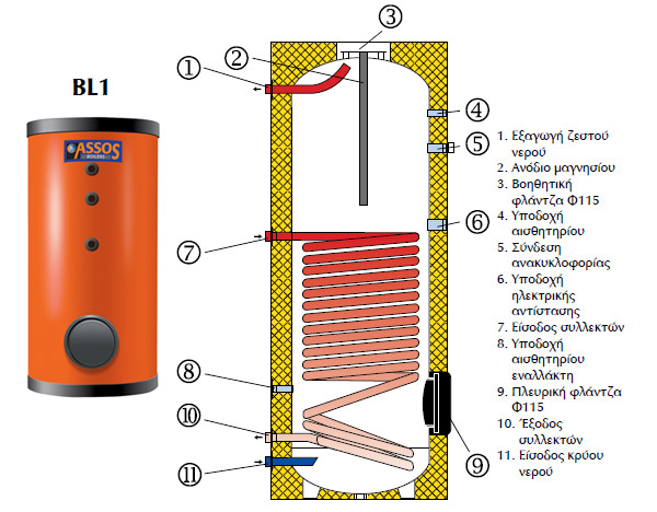 Τα κάθετα μπόιλερ λεβητοστασίου “Assos Boilers” κατασκευάζονται σε ποικιλία τύπων, σύμφωνα με τις προδιαγραφές DIN 4753 και EN 12897, ελέγχονται σύμφωνα με διεθνείς κανόνες υγιεινής και έχουν χωρητικότητα 150 με 1000 λίτρα.